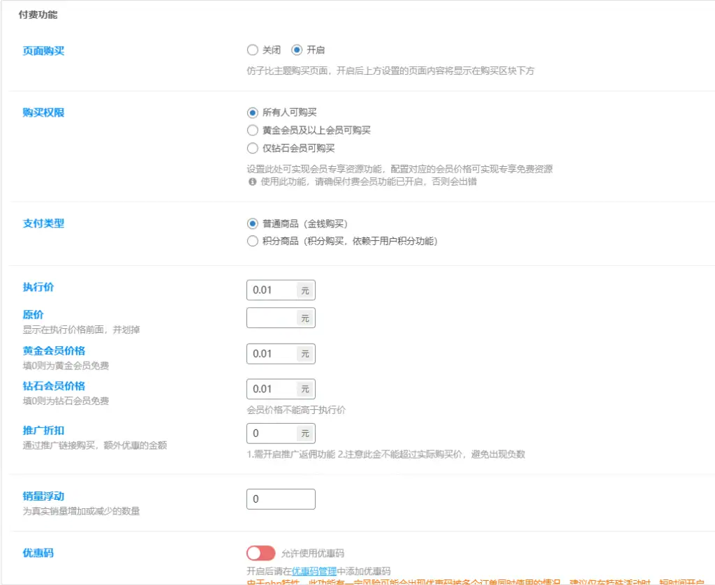 仅简单支持了页面购买功能,绑定页面id,显示的按钮为跳转链接,无授权功能,会员价格为0或免费则无法购买,有兴趣的可以购买后自己写调用支付的功能,后续可能会写成页面发卡插件进行销售,具体看我有没有空去写