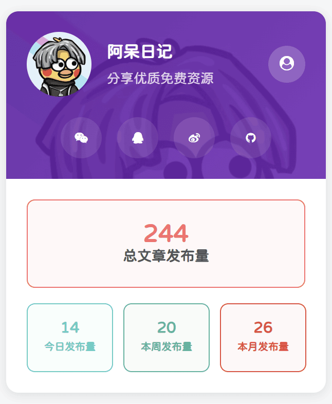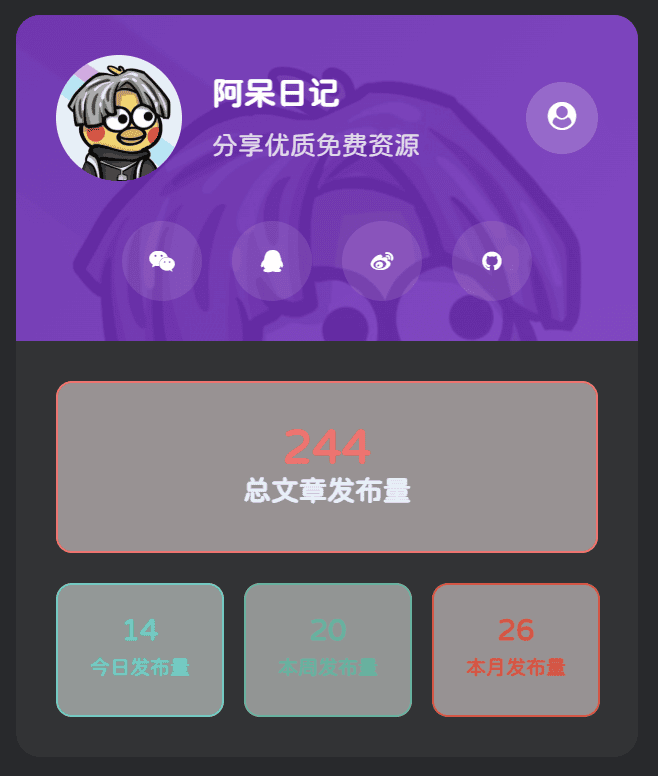 子比主题-阿呆日记信息卡小工具daixbu5个月前更新关注私信09915基于CFS框架的自定义信息卡小工具,支持日夜模式切换预览图日间夜间教程 此处内容已隐藏,请付费后查看子比主题-阿呆日记信息卡小工具此内容为付费资源,请付费后查看388积分黄金会员免费钻石会员免费登录购买积分不够?点我 快速购买积分 1元 = 100积分付费资源已售 1© 版权声明 © 版权声明 All Rights Reserved 免责声明:本站提供用户下载的所有资源均来自网络,版权归作者本人所有,仅限学习和研究目的的,请支持正版! 我们非常重视版权问题,如有侵权请邮件与我们联系处理。敬请谅解!邮件:3487871606@qq.comTHE END子比美化子比美化# 小工具点赞15 分享QQ空间微博QQ好友复制链接收藏